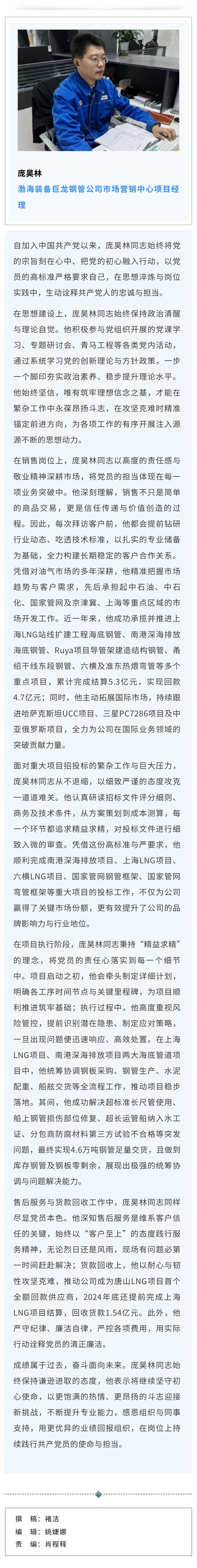 渤海装备庞昊林:红心向党践宗旨 深耕市场创佳绩