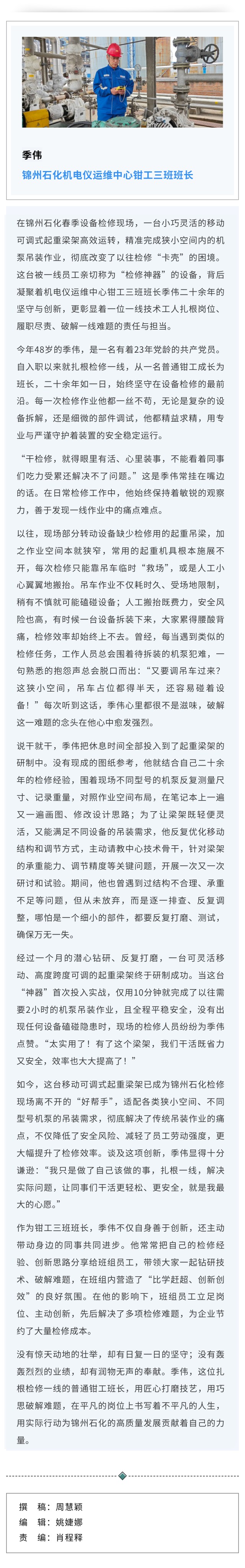 锦州石化季伟:扎根检修一线的创新者